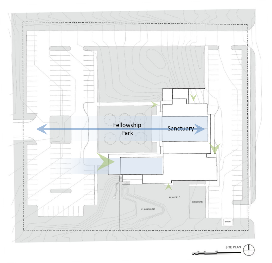 The axis continues through a large porch and outdoor Fellowship Park to the west entrance road. This axis serves to orient all rooms within the building and is a physical representation of the central mission of connecting the gospel message to the community beyond.