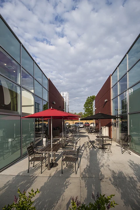 A two-building solution creates a useful gap in the street façade. This gap yields additional end caps for better rentability to benefit the owner, and outdoor seating to benefit pedestrian circulation and a walkable character. In the end, the retail strip is reinvented with no back side. It has two beautiful fronts, one to the parking side and one to the street. The scale of Hanley Road is reduced, pedestrian circulation is enhanced, and commercial visibility is maximized. Both the developer and the community win.